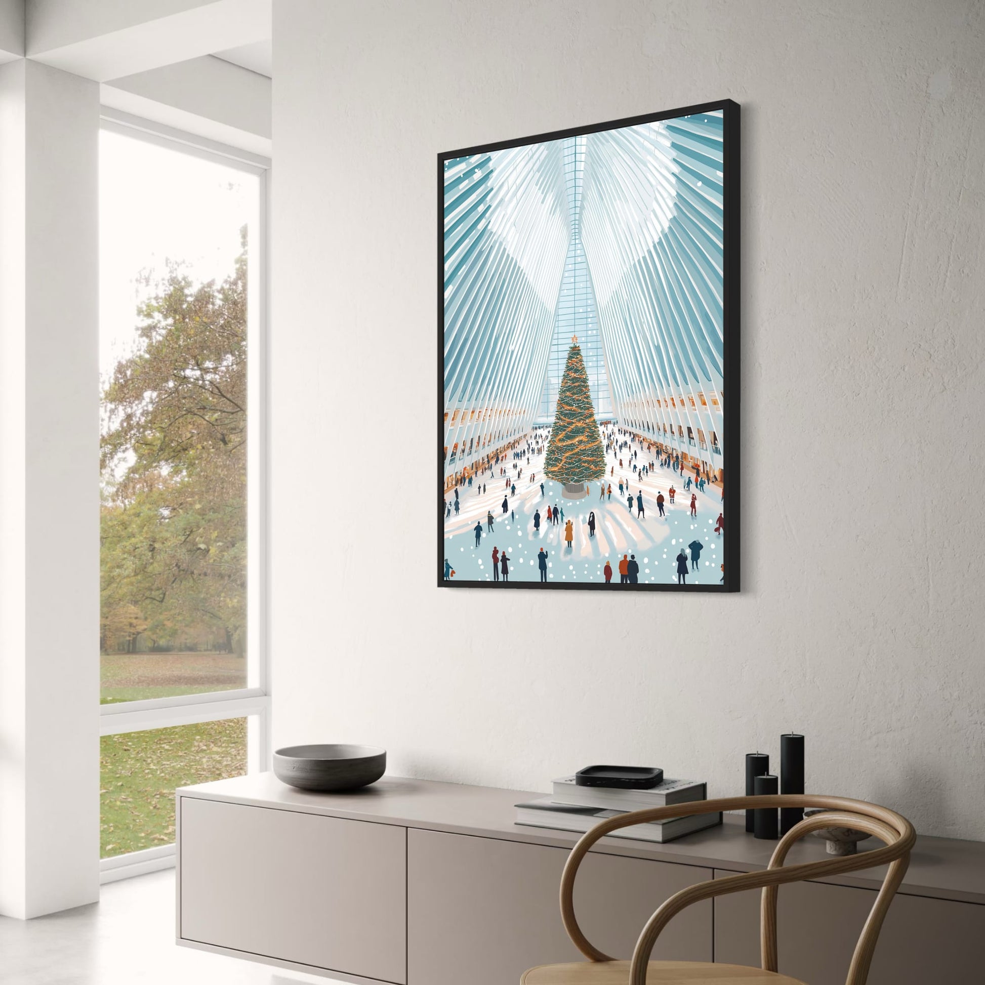 Holiday Spirit | Majestic Christmas Tree | Modern Atrium | Snowy Atmosphere Poster | Festive Decor | Interior Scene | Seasonal Celebrations | Perfect for Winter Wonderland Theme | Print