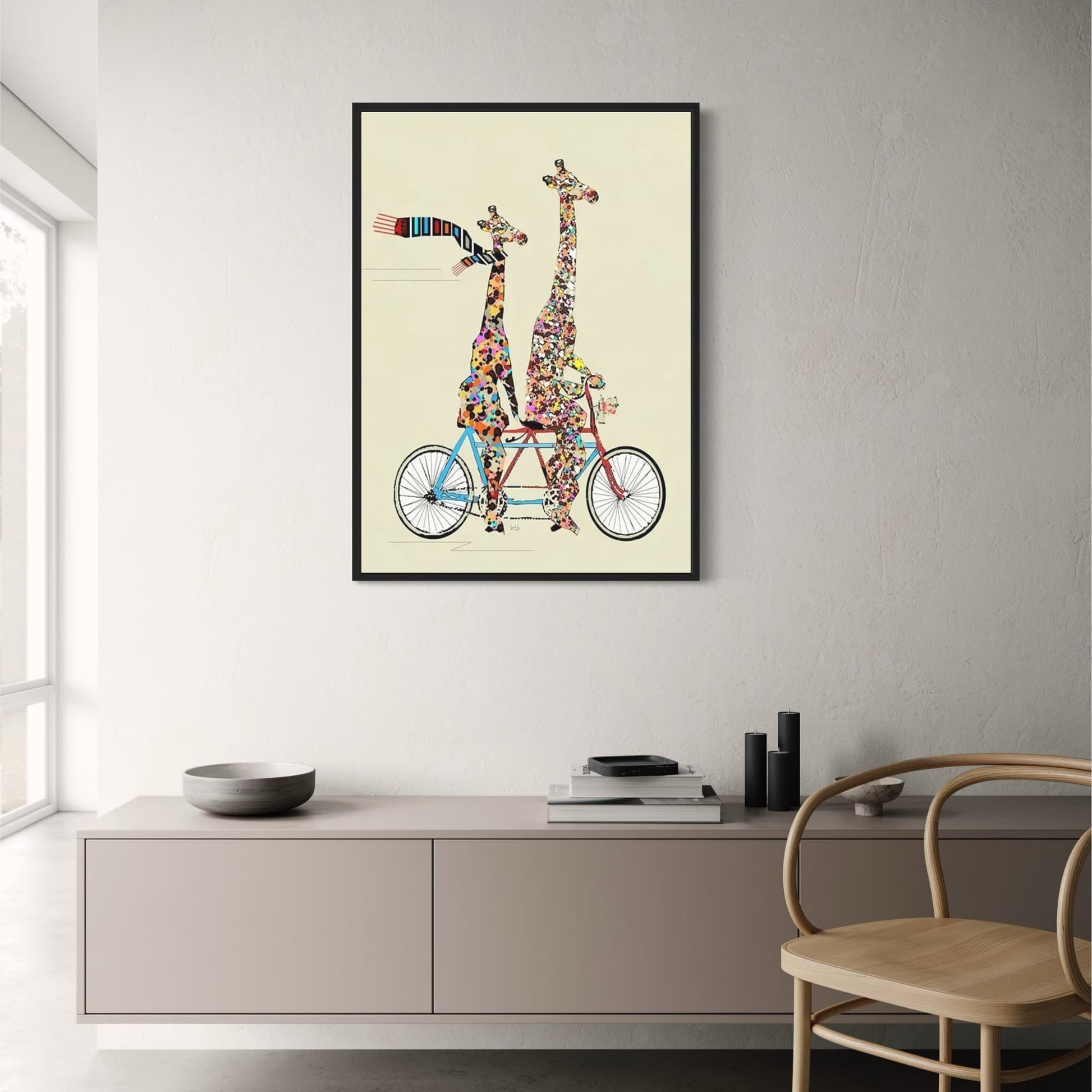 Giraffe's Patchwork Pedal Poster | Whimsical Wheels | Colorful Animated Adventure Decor | Joyful Journey Wall Art